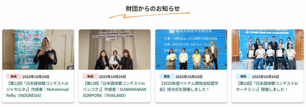 財団からのお知らせ HOME 財団からのお知らせサイトをリニューアルいたしました! サイトをリニューアルいたしました! お知らせ 2025年11月4日 2025年11月4日に、当財団のサイトをリニューアルいたしました!当財団は、2025年11月7日で設立30周年を迎えます。これに伴い、当財団のことをこれまで以上に深く知ってもらうため、より見やすいサイトデザイン、より使いやすいサイト設計に一新いたしました。 モバイルサイトをより見やすく一新 (左:旧サイト/右:新サイト) モバイルサイトを、文字が大きくすっきりとしたデザインに一新。近年はほとんどのユーザーがスマートホンからウェブサイトを閲覧するという現状を受け、画面の小さいスマートホンからでも情報が分かりやすく、当財団のことをより理解してもらえるレイアウトにリニューアルいたしました。 トップページ「財団からのお知らせ」を一新 トップページ「財団からのお知らせ」にサムネイルを追加することで、お知らせの内容や事業の様子がより分かりやすくなりました。 新規ページを追加 奨学生募集 選考スケジュールや奨学金種別ごとの募集要項などをまとめた「奨学生募集」ページを追加することで、奨学金への応募手続きについて一目で分かるようになりました。 海外発信 国外で日本留学を希望する学生に対して無償で情報提供を行うことを目的とした、海外発信事業についてご紹介する「海外発信」ページを追加いたしました。 HIKARI KYORITSU INTERNATIONAL SCHOOL カンボジアのシェムリアップにて日本語教育を行う「HIKARI KYORITSU INTERNATIONAL SCHOOL」についてご紹介するページを追加いたしました。